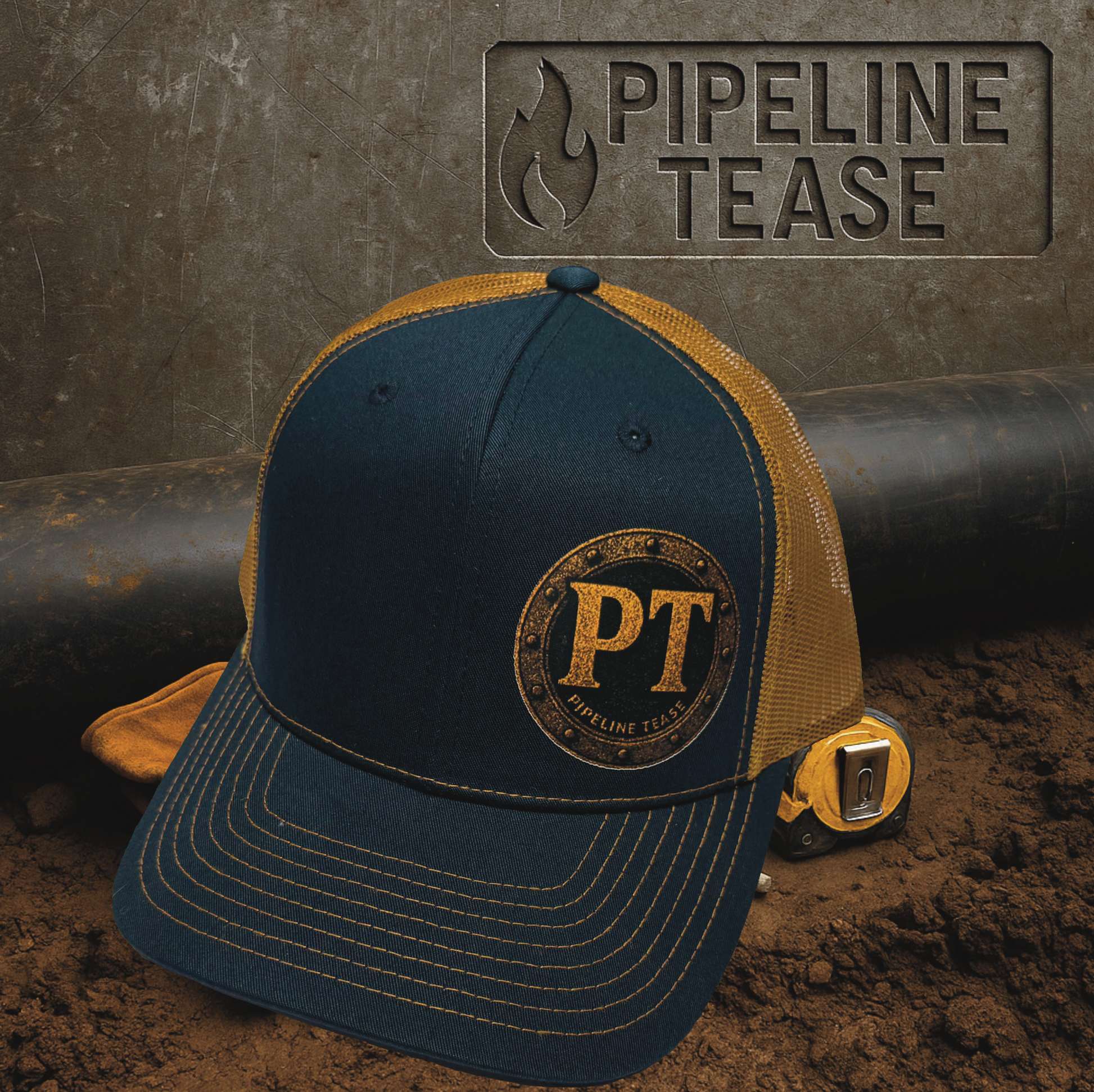 This hat doesn’t shout — it just outworks. Deep navy up front, gold mesh in the back, and a riveted PT logo that looks like it came off a busted pressure vessel. Worn by the ones who’ve been here, done that, and don’t need to talk about it.